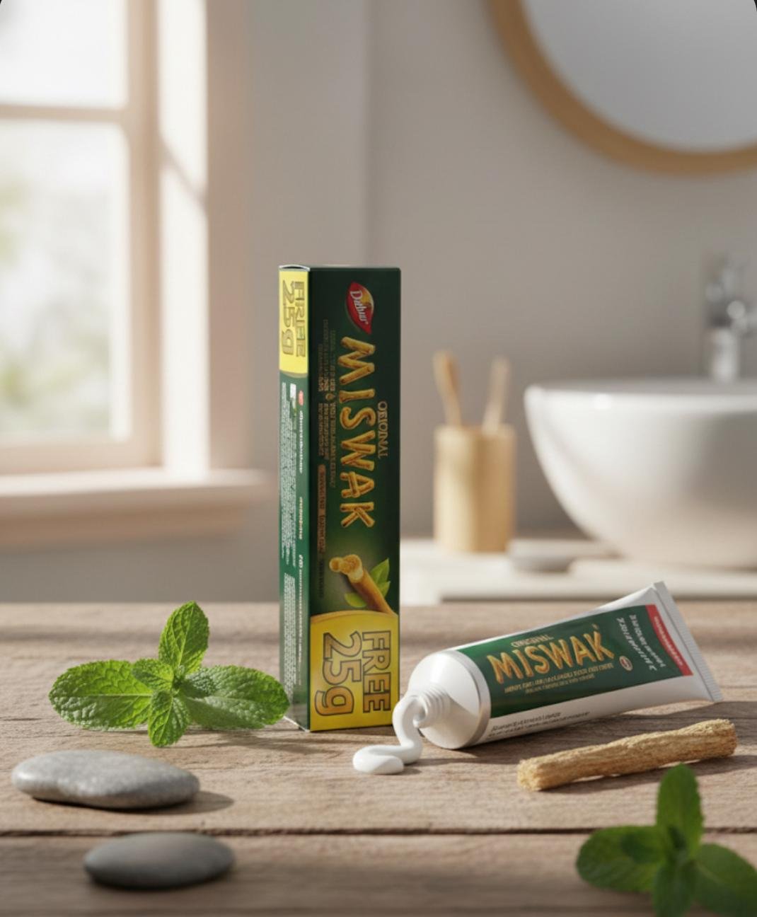 Le dentifrice Miswak original de Dabur enrichi en siwak purifie et protége vos dents naturellement . Grace a ses propriétés antibactériennes , il renforce les gencives , lutte contre la plaques et les caries , illumine le sourire et offre une haleine fraiche durable . Idéal pour toute la famille .